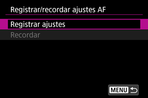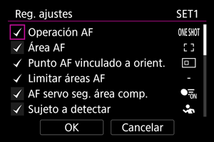 - Se registrarán todos los ajustes de AF seleccionados. Para borrar o volver a seleccionar los ajustes, gire el dial