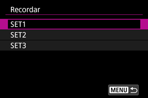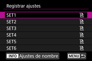 - Los ajustes actuales de la cámara se enumeran en la pantalla en el paso 4, que se utiliza para registrar ajustes. Los elementos enumerados en esta pantalla no se pueden cambiar.