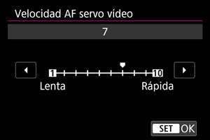 Puede ajustar la velocidad AF para AF servo vídeo. Esta función está activada con [AF servo vídeo], en [: AF servo vídeo], ajustado en [Activ.] cuando utilice objetivos compatibles con la transición de enfoque lenta durante la grabación de vídeo.*