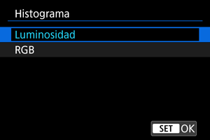 Los histogramas muestran los niveles de señal a través de la gama tonal. Están disponibles la visualización de la luminosidad (para comprobar el nivel de exposición general y la gradación global) y la visualización RGB (para consultar la saturación y la gradación de rojo, verde y azul). Puede cambiar el histograma que se muestra presionando el botón cuando se muestre [