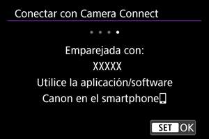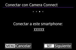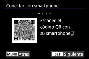 - Si Camera Connect no está instalado, escanee con el smartphone el código QR que se muestra en la pantalla, acceda a Google Play o App Store para instalar Camera Connect y, a continuación, presione