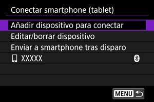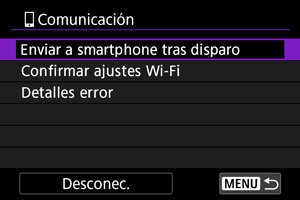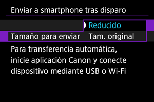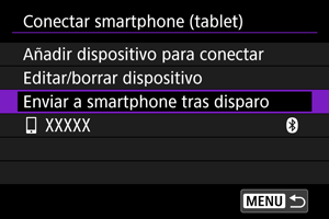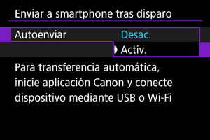 Puede enviar las fotografías a un smartphone automáticamente. Antes de seguir estos pasos, asegúrese de que la conexión Wi-Fi entre la cámara y el smartphone haya finalizado.