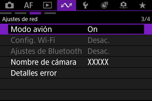 Si prefiere no permanecer conectado a la cámara mediante Wi-Fi/Bluetooth cuando esta esté apagada, ajuste [: Modo avión] en [On] o ajuste [