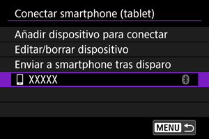 - No es posible conectar la cámara a dos o más smartphones al mismo tiempo a través de Bluetooth. Para cambiar a un smartphone diferente para la conexión Bluetooth, consulte Reconexión a través de Wi-Fi/Bluetooth.