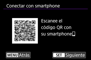 - Si Camera Connect no está instalado, escanee con el smartphone el código QR que se muestra en la pantalla, acceda a Google Play o App Store para instalar Camera Connect y, a continuación, presione