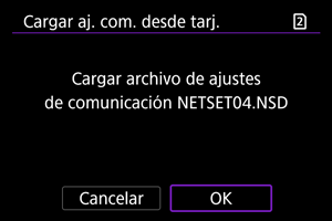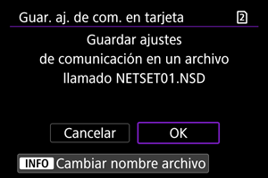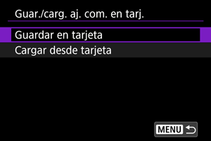 : Guardar/Cargar aj cám en tarj] permite guardar todos los ajustes de comunicación de la cámara en una tarjeta o cargar todos los ajustes de comunicación para otra cámara desde una tarjeta.