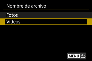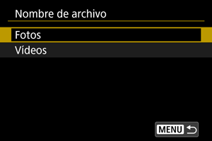 Los nombres de archivo constan de cuatro caracteres alfanuméricos seguidos por un número de archivo de cuatro dígitos () y una extensión de archivo. Puede cambiar los primeros cuatro caracteres alfanuméricos, que de manera predeterminada son únicos para cada cámara y se ajustan cuando la cámara sale de fábrica.