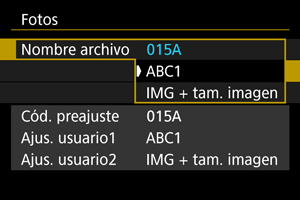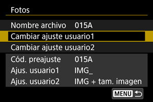 El ajuste de usuario 1 le permite registrar cuatro caracteres que desee. El ajuste de usuario 2 añade los tres caracteres registrados iniciales que desee a un cuarto carácter que representa el tamaño de imagen y que se añade automáticamente después de disparar.