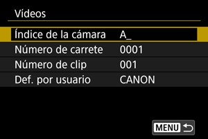 - Ajuste valores predeterminados para [Número de carrete] y [Número de clip] según sea necesario.