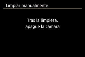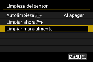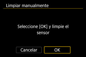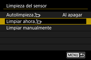 • Aunque repita la limpieza del sensor, el resultado no mejorará mucho. Tenga en cuenta que, inmediatamente después de la limpieza, quizá no esté disponible [Limpiar ahora].