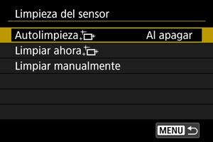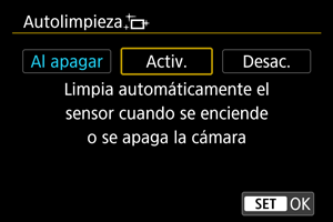 • Cuando se ajusta en [Al apagar] o [Activ.], el sensor se limpia cuando se apaga la pantalla, incluso si se ha apagado automáticamente.