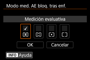 Para cada modo de medición, puede especificar si se bloquea la exposición (Bloqueo AE) una vez que se enfocan los motivos con AF foto a foto. La exposición se bloqueará mientras mantenga presionado el disparador hasta la mitad. Seleccione modos de medición para el bloqueo AE y añada una marca de verificación []. Seleccione [OK] para registrar el ajuste.