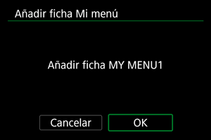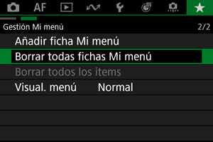 Puede borrar todas las fichas Mi menú que haya creado. Cuando seleccione [Borrar todas fichas Mi menú], todas las fichas de [MY MENU1] a [MY MENU5] se eliminarán y la ficha [] recuperará su estado predeterminado.