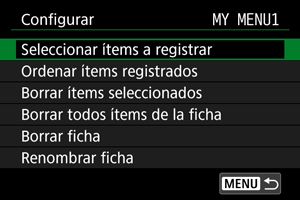 Puede eliminar todos los elementos registrados bajo las fichas [MY MENU1] a [MY MENU5]. Las propias fichas se mantendrán. Cuando se seleccione [Borrar todos los ítems], todos los elementos registrados en todas las fichas creadas se eliminarán.