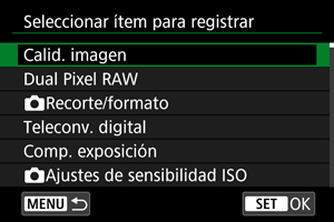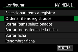 Puede cambiar el orden de los elementos registrados en Mi menú. Seleccione [Ordenar ítems registrados], seleccione un elemento para reordenarlo y, a continuación, presione
