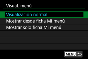 Puede seleccionar [Visual. menú] para ajustar la pantalla de menú que aparecerá primero cuando presione el botón .