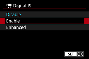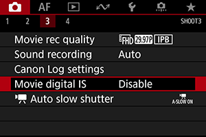 - Kui kasutate TS-E-objektiivi, kalasilmobjektiivi või mitte Canoni objektiivi, siis soovitame määrata video digitaalse kujutisestabilisaatori funktsiooni olekusse [Disable/Keela].