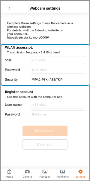 - Kui unustate oma veebikaamera konto kasutajanime või parooli, siis vajutage kõikide seadete kustutamiseks ning punkti 4 toimingu uuesti tegemiseks [Clear set./Tühjenda seaded].