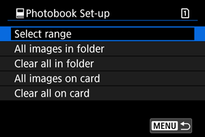 Kui valite [All images in folder/Kõik kausta pildid] või [All images on card/Kõik kaardi pildid] valiku [Multiple/Mitu] jaoks menüüst [: Photobook Set-up/