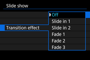 - Määrake fotode jaoks määrangud [Display time/Kuvamise aeg], [Repeat/Kordus] (kordusega taasesitus) ja [Transition effect/Üleminekuefekt] (piltide vahetamise efekt).