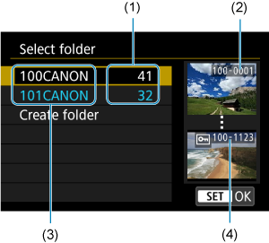 - Kaust mahutab kuni 9999 pilti (failinumbrid 0001–9999). Kui kaust saab täis, siis luuakse automaatselt ühe võrra suurema numbriga uus kaust. Uus kaust luuakse automaatselt ka käsitsi lähtestamisel (). Luua saab kaustu numbritega 100 kuni 999.
