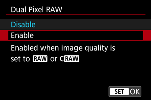 - Kaamera salvestab RAW-kujutise, kuhu on lisatud Dual Pixel-andmed (Dual Pixel RAW-kujutis).