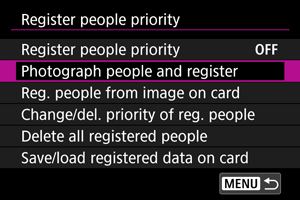 Saate registreerida inimesed kaamerasse, et kaamera saaks tuvastada nende näod ning prioriseerida teravustamise, heleduse ning värvitoonid nende alusel. Näo registreerimiseks tehke kellestki foto või kasutage kaardil olevat pilti.