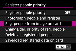 - Kui soovite laadida registreeritud andmed kaardilt ning kirjutada kaameras olevad andmed üle, siis valige [Load from card (overwrite)/Laadi kaardilt (kirjuta üle)]. Mis tahes kaamerasse registreeritud andmed kustutatakse.
