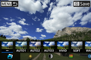 , siis saate valida valikute [VIVID/ERGAS], [SOFT/PEHME] või teiste eelseadistatud efektide vahel. [AUTO1/AUTOMAATNE1], [AUTO2/AUTOMAATNE2] ja [AUTO3/AUTOMAATNE3] on kaamera poolt soovitatud pilditingimustel põhinevad efektid.