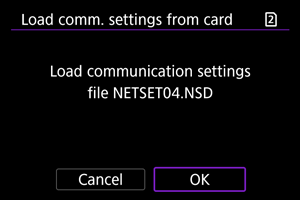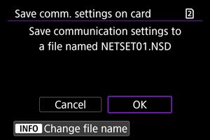 : Salvesta/laadi määrangud kaardile/kaardilt] võimaldab salvestada kõik kaamera andmesidemäärangud kaardile või laadida kõik teise kaamera andmesidemäärangud kaardilt.