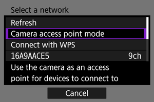 Valige menüüst [Select a network/Võrgu valik] valik [Camera access point mode/Kaamera pääsupunktirežiim].
