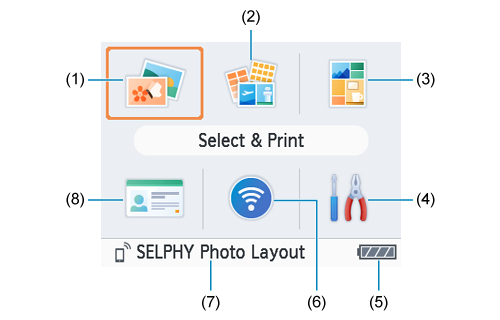 Kuvab aku kasutamisel allesolevat aku laetuse taset 1–4. - (6) Wi-Fi seaded