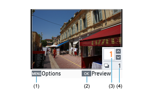 - (3) Praeguse pildi prinditavate koopiate arv. Segaprintimisel või dokumendifotode printimisel kuvatakse linnuke.