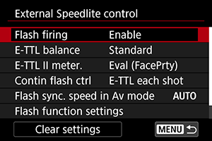 Functions of EL/EX Series Speedlites compatible with flash function settings can be set via a camera menu screen. Attach the Speedlite to the camera and turn on the Speedlite before setting the flash functions.