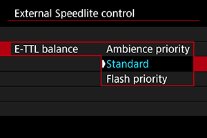 You can set your preferred appearance (balance) for flash shots. This setting enables you to adjust the ratio of ambient light to Speedlite light output.