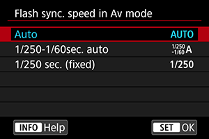 • High-speed sync is not available in Aperture priority AE mode when set to [1/250-1/60sec. auto] or [1/250 sec. (fixed)].