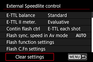 • Select [Clear flash settings] or [Clear all Speedlite C.Fn's].