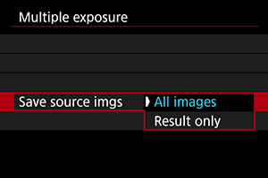 With [Save source imgs: All images], saves all single exposures and the multiple-exposure image created so far and exits multiple-exposure shooting. With [Save source imgs: Result only], saves only the multiple-exposure image created so far and exits multiple-exposure shooting. |