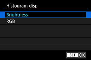 The histograms show signal levels across the tonal range. Brightness display (for checking the general exposure level and overall gradation) and RGB display (for checking saturation and gradation of red, green, and blue) are available. You can switch the histogram displayed by pressing the button when [