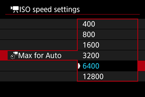 ] mode with ISO Auto. By default, the maximum limit is set to ISO6400. The maximum limit can be set in a range of ISO 400–12800.