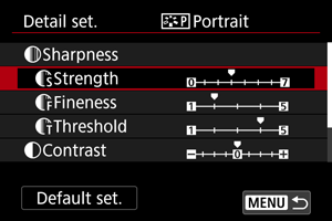 - By selecting [Default set.] in step 3, you can restore the parameter settings of the respective Picture Style to the defaults.