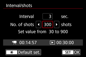 - With an SDHC card, the playback time is displayed in red if the [No. of shots] setting results in a file size exceeding 4 GB. If you keep recording in this condition and the movie file size reaches 4 GB, the time-lapse movie recording will stop.