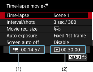 Indicates the movie recording time (time required to play back the movie) when creating the time-lapse movie in 4K movie or Full HD movie from the still photos taken with the set intervals.