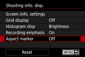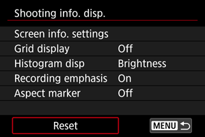 1. Select [Shooting: Shooting info. disp.] (, ).