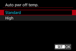 You can set the maximum camera body temperature at which the camera automatically turns off. Setting this level higher than the standard temperature can extend the available shooting time by removing some operating restrictions.