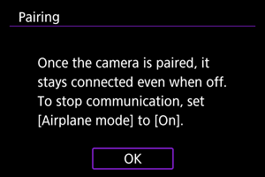 • A message is displayed if the camera is already paired with another device. Select [OK] to end the current Bluetooth connection.