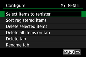 You can delete the current My Menu tab. Select [Delete tab] to delete the [MY MENU*] tab.
