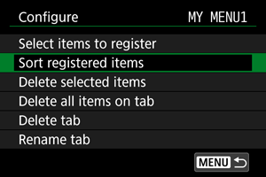 You can change the order of the registered items in My Menu. Select [Sort registered items], select an item to rearrange, then press