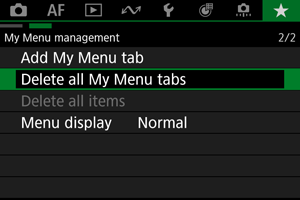 You can delete all My Menu tabs you created. When you select [Delete all My Menu tabs], all the tabs from [MY MENU1] to [MY MENU5] will be deleted and the [] tab will revert to its default.