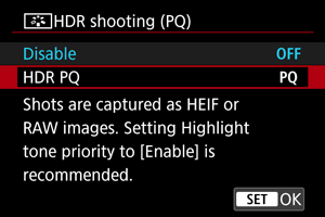 [HDR shooting (PQ)] enables you to capture high dynamic range images that retain detail in highlights and shadows and conform to the PQ specification (referring to the input signal gamma curve for HDR image display) defined in ITU-R BT.2100 and SMPTE ST.2084.